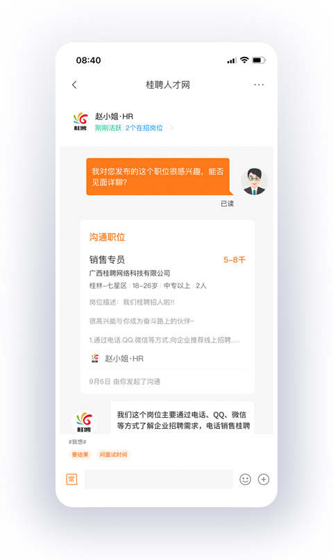 內(nèi)置豐富的求職常用語,輕松掌握,簡單點(diǎn)擊,隨時(shí)隨地與HR溝通高效了解自己想要的招聘信息
